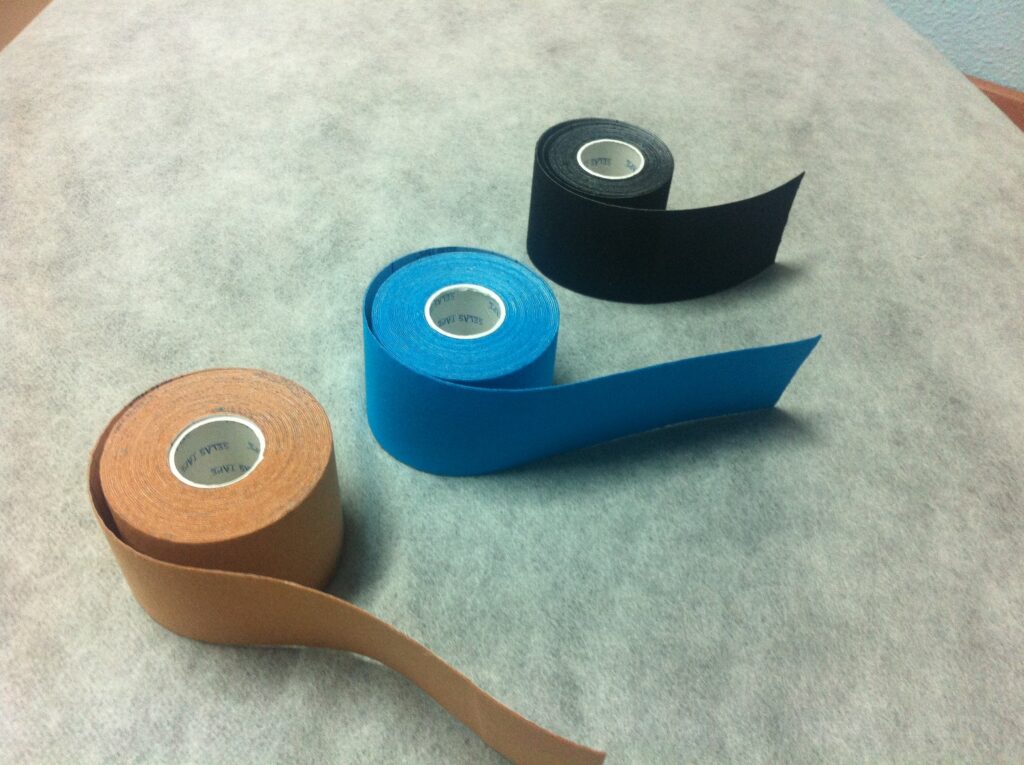 Las famosos tiras de colores, o, hablando con propiedad, vendaje neuromuscular o Kinesio tape, se han empezado a ver y utilizar más en los últimos años. No obstante, su aparición se remonta a la década de los 70 en Asia, sobre todo en Corea y Japón. Consiste en una fina cinta adhesiva de algodón poroso con un lado adhesivo para fijarse a la zona en la que se aplica. Tiene aproximadamente el grosor y el peso de la propia piel y una de sus principales características es su capacidad para extenderse hasta un total de un 120-140 % de su longitud original. Esta extensibilidad hace posible que, a diferencia de los esparadrapos de vendaje convencional, la zona vendada conserve la movilidad. Otra ventaja es que tanto la tela como el adhesivo son resistentes al agua, por lo que puede utilizarse en deportes acuáticos y, a nivel particular, permite mojarse sin problema ya que el tiempo que debe durar la aplicación del vendaje es de 3 a 5 días.